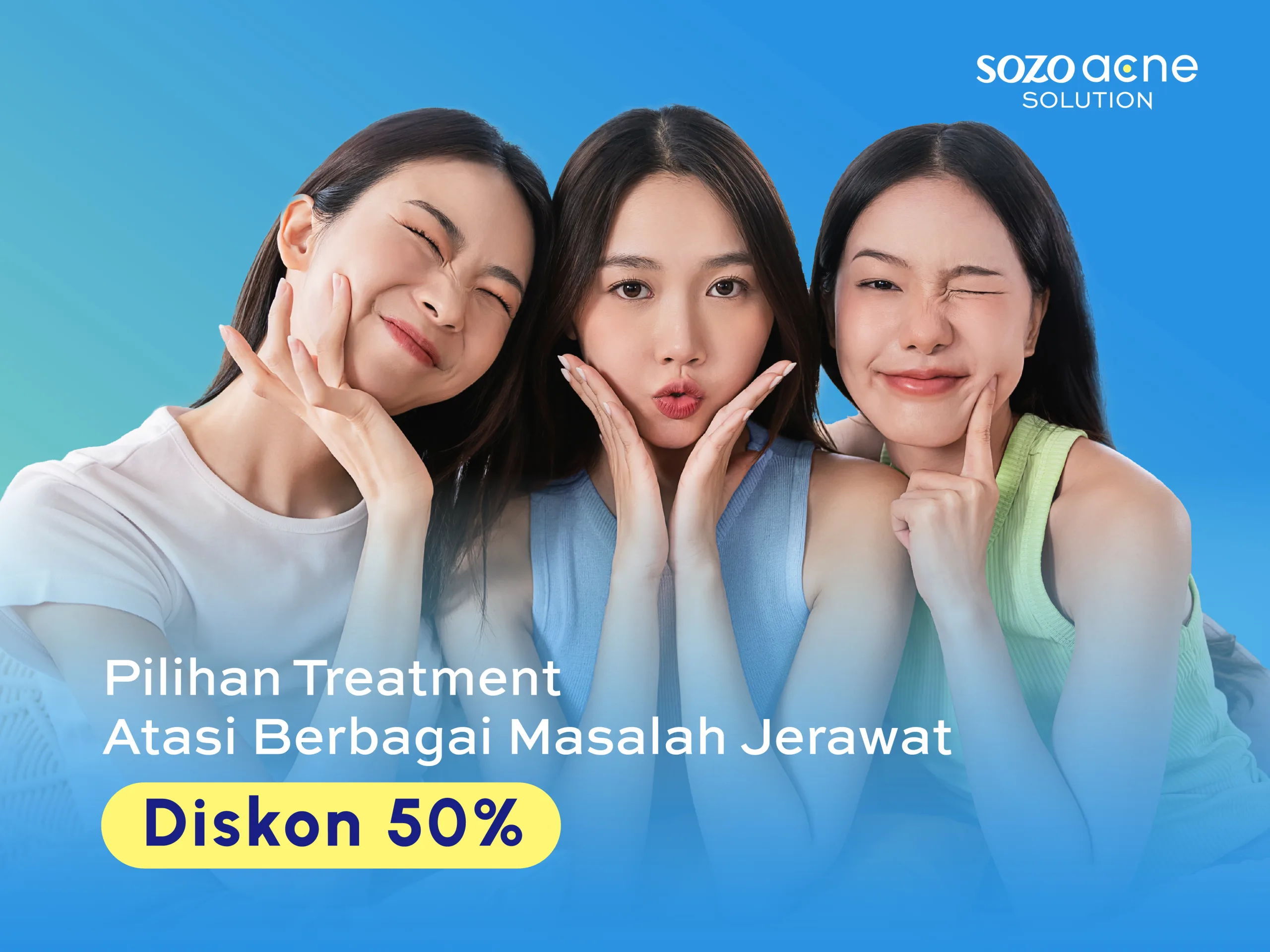 Kami menyediakan berbagai solusi untuk mengatasi jerawat yang disesuaikan dengan kondisi kulit Anda, di antaranya: IPL Acne (menggunakan teknologi cahaya untuk mematikan bakteri), Acne Peel (mengangkat sel kulit mati dan membersihkan pori), dan Meso Acne (memasukkan serum khusus ke lapisan kulit).